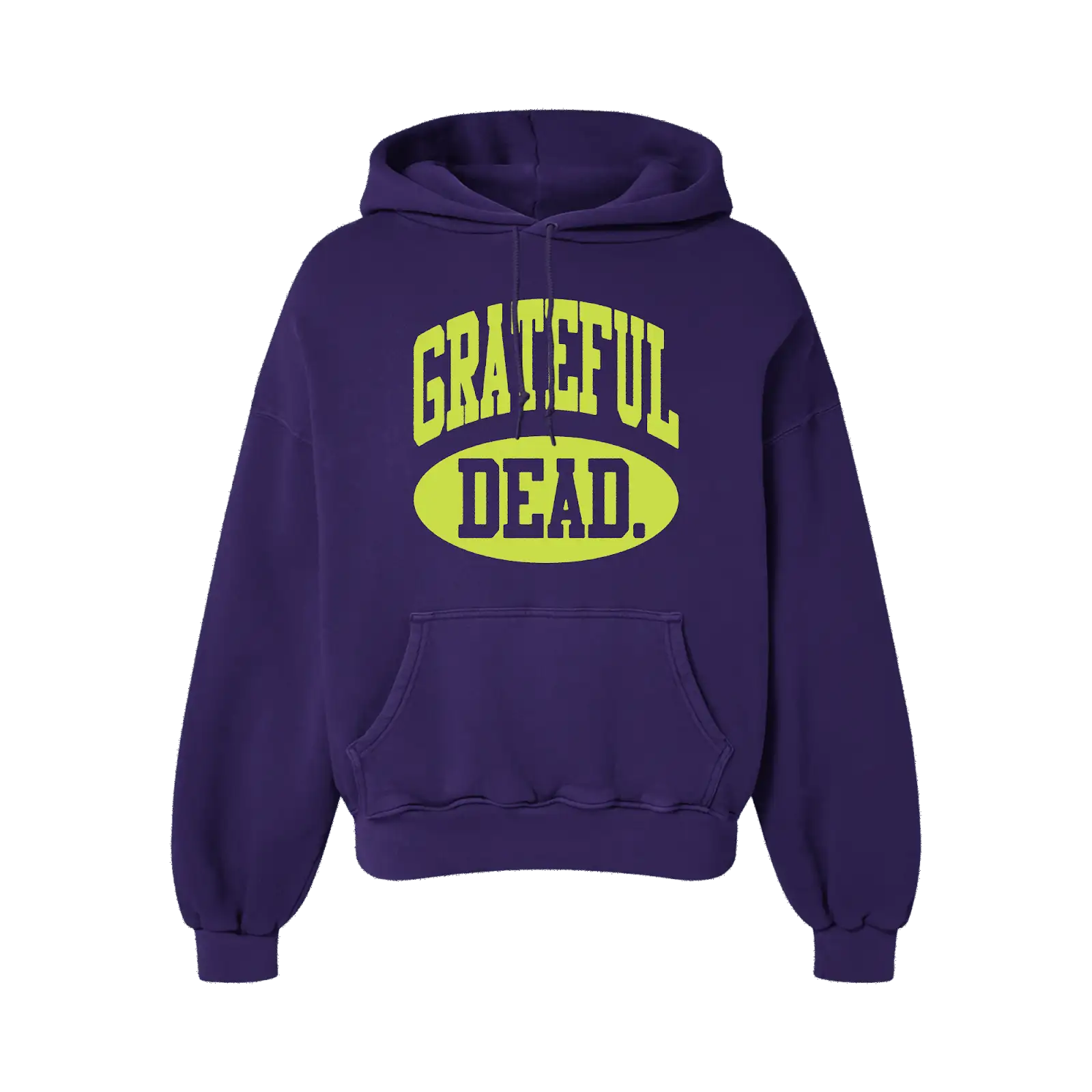 Gildan #18500 Unisex Heavy Blend Hooded Sweatshirt printed on front with Grateful Dead collegiate style logo. Garment is 8 oz./yd² (US) 13.5 oz./L yd (CA) & made from 50% cotton, 50% polyester.