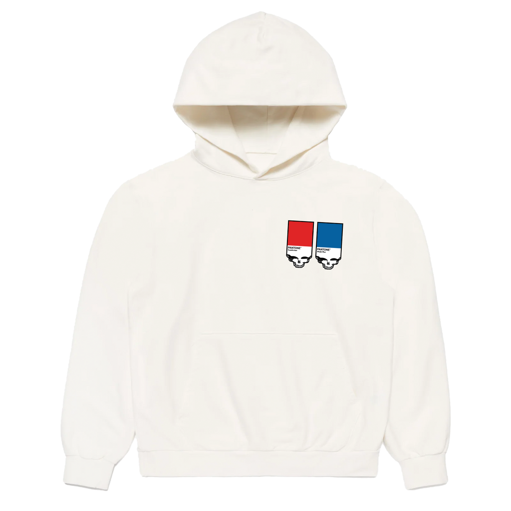Unisex Midweight Hooded Sweatshirt printed on front with official Grateful Red & Stealie Blue pantone chips with Stealie face.