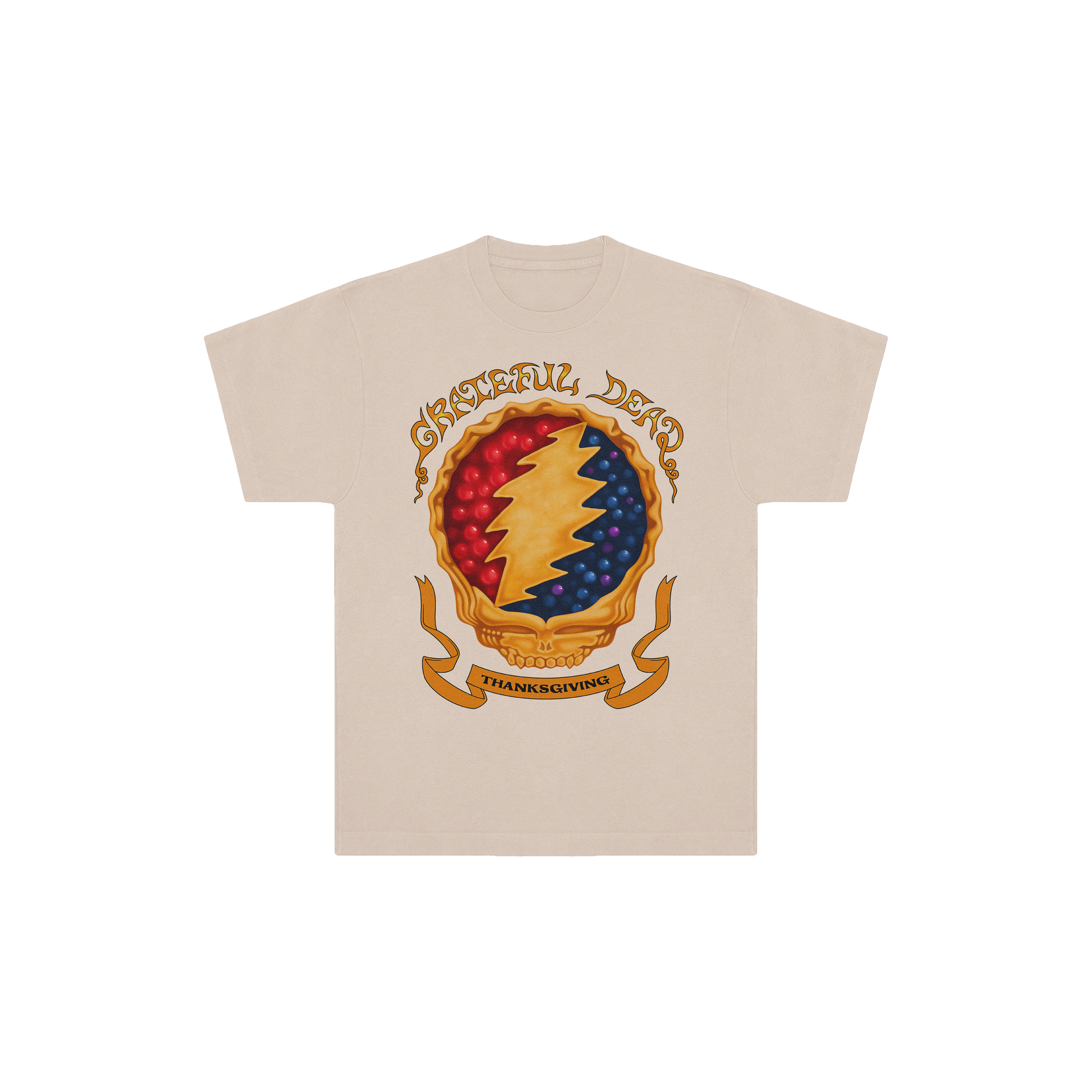 Ivory Garment-Dyed Heavyweight T-Shirt printed on front & back with Thanksgiving-theme SYF artwork. Due to the dying process of the t-shirt, actual coloring may vary slightly.